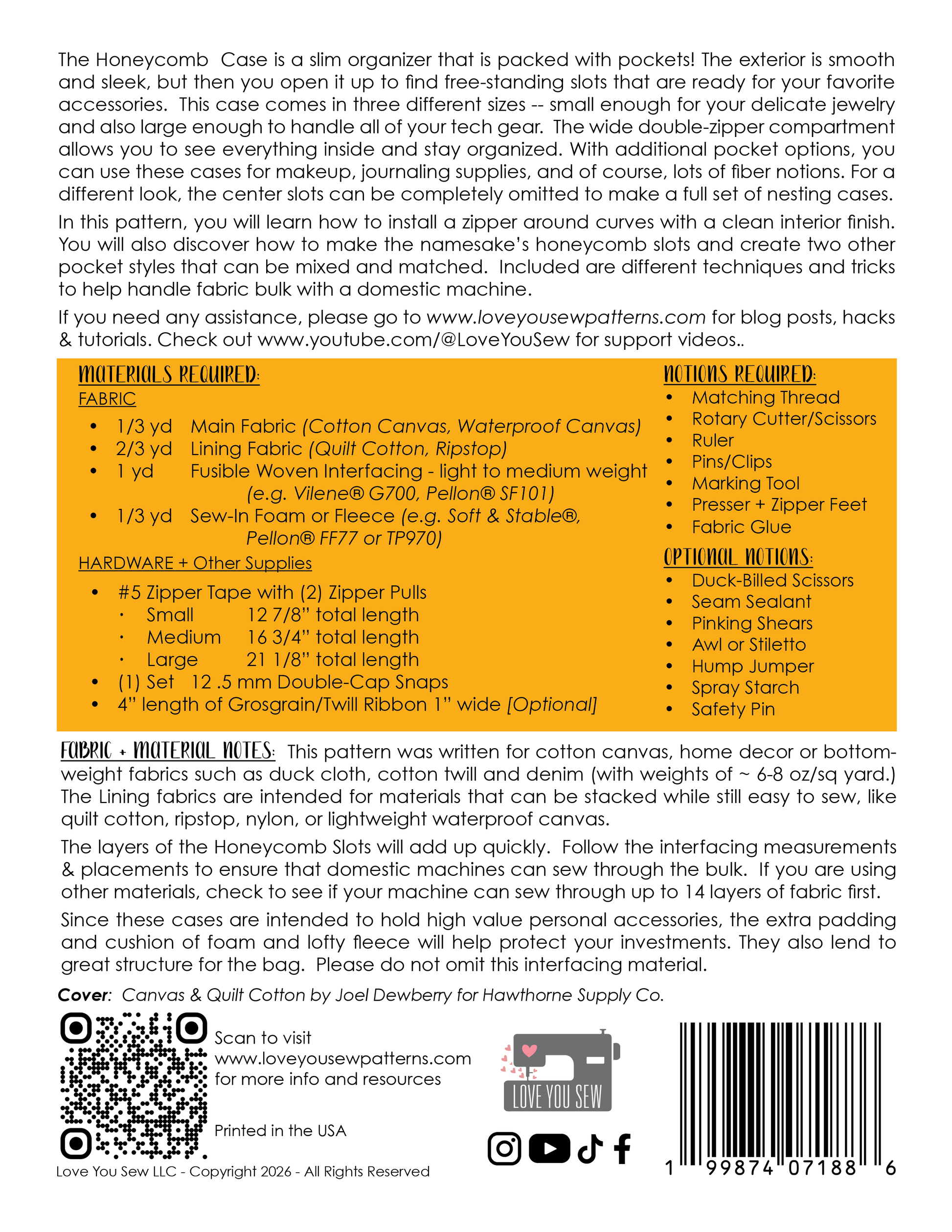 In this pattern, you will learn how to install a zipper around curves with a clean interior finish. You will also discover how to make the namesake’s honeycomb slots and create two other pocket styles that can be mixed and matched. Included are different techniques and tricks to help handle fabric bulk with a domestic machine.